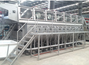| 布面包覆在沖孔的轉(zhuǎn)鼓上,被6支水刀進(jìn)行穿透式水洗,效率高,無損傷,水洗壓力可調(diào),配有獨立過濾系統(tǒng),以提高水的重復(fù)利用。 | "U"型堆置式浸泡,每槽配有獨立的噴淋系統(tǒng)和軋車系統(tǒng),同時配有獨立過濾系統(tǒng),每槽容布量可調(diào)(30M-150M),可以適應(yīng)80-600g/㎡克重的織物,有8槽、12槽和16槽可選。 |